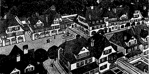 die durch eine aquarellierte Federzeichnung von Albrecht Kauw aus dem